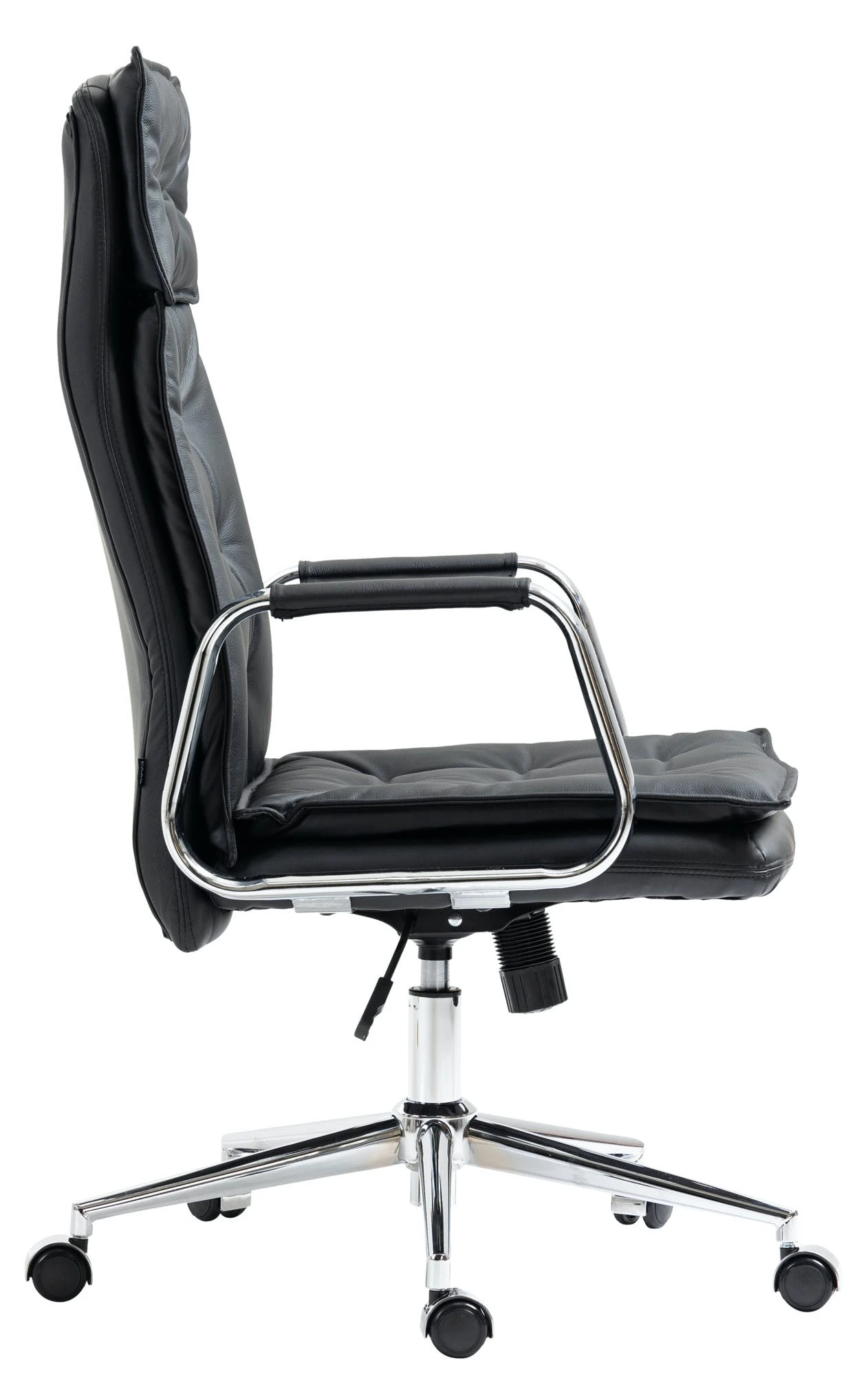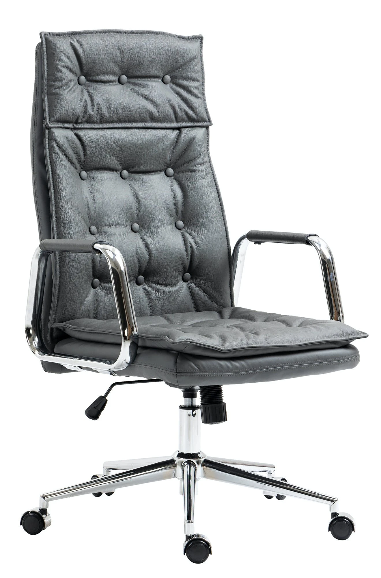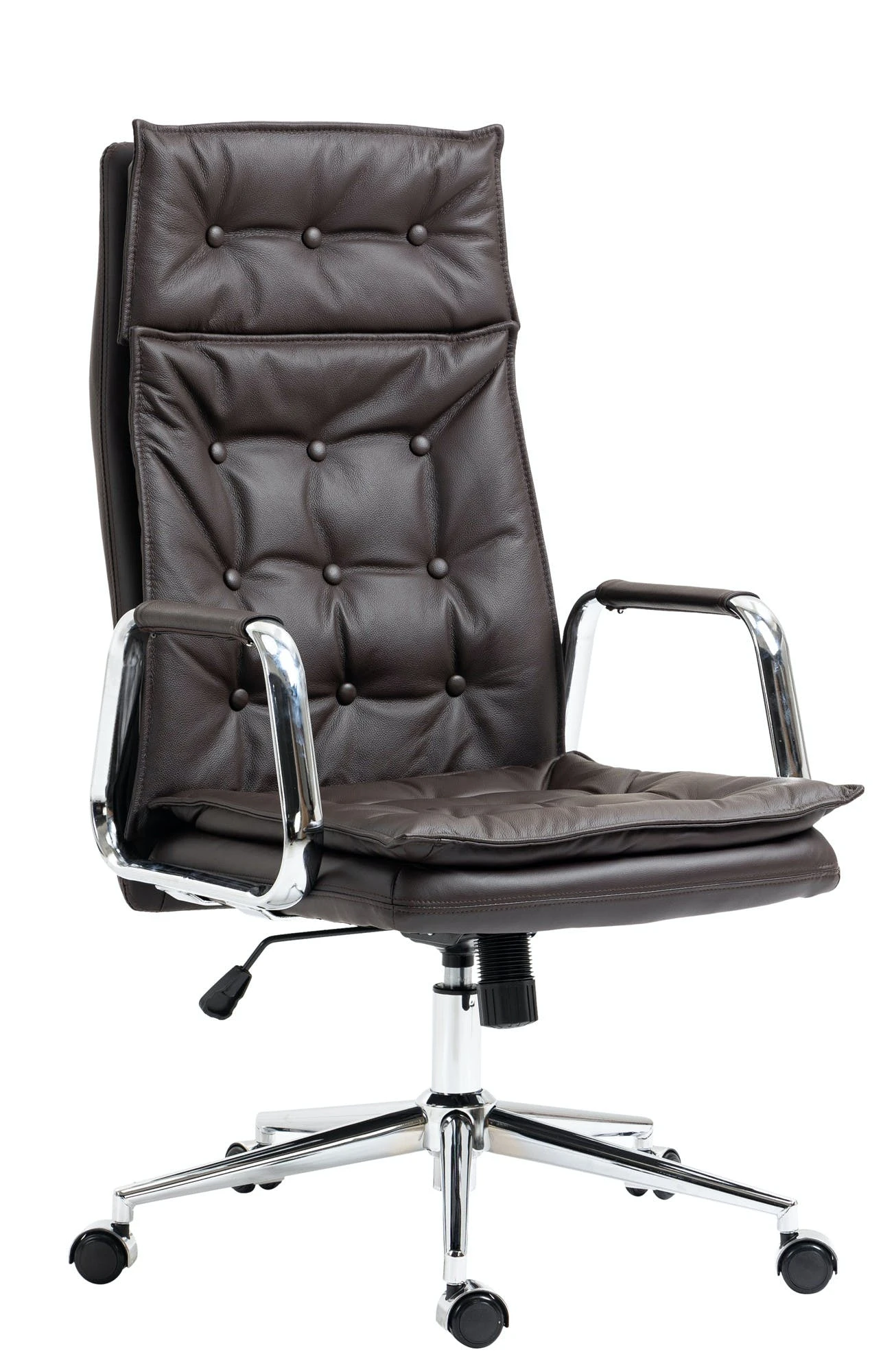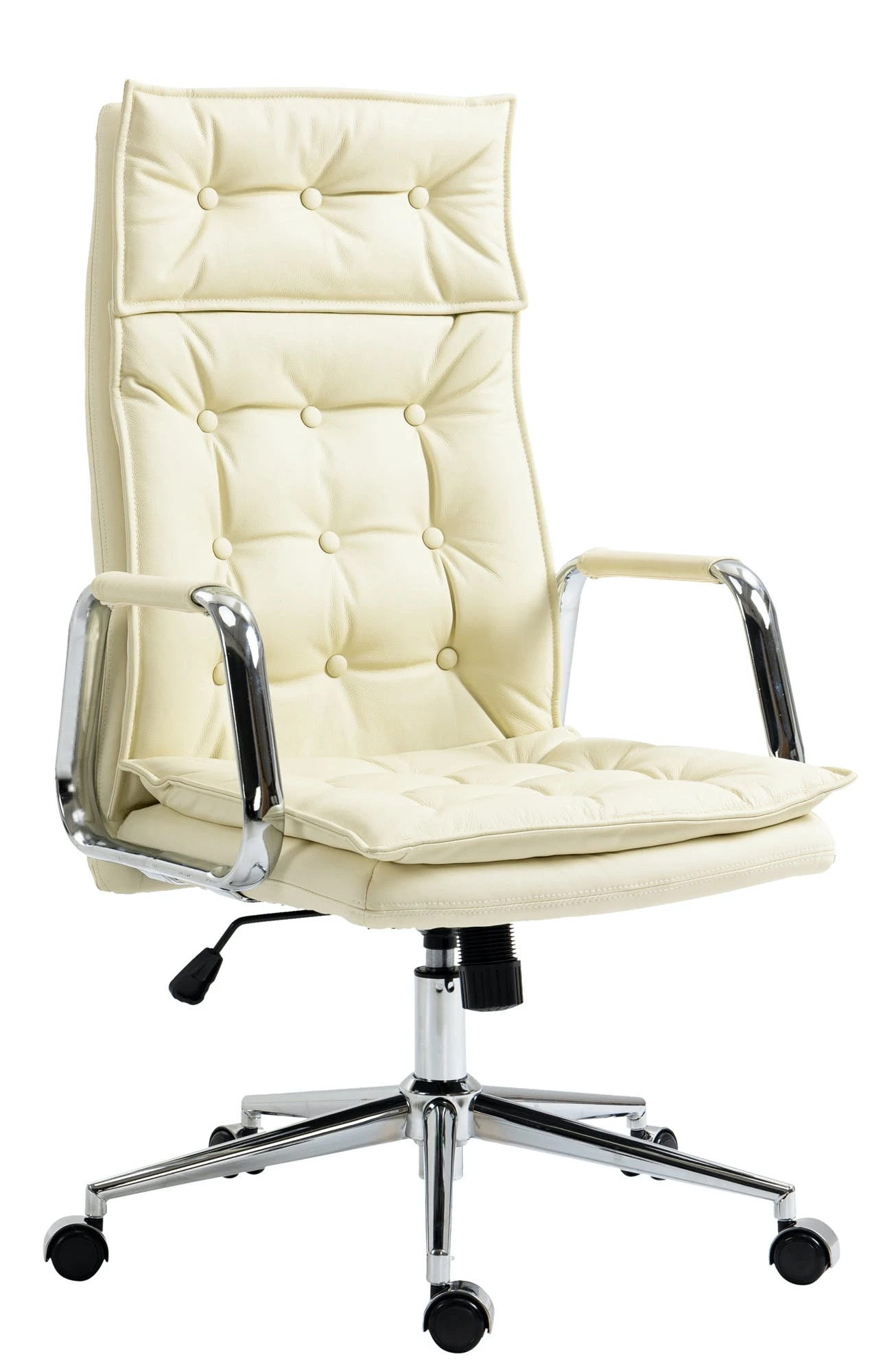 Der exklusive Chefsessel Sotira ist ein Schreibtischstuhl mit einer sehr hochwertigen Polsterung und moderner Optik. Der Echtlederbezug im Chesterfield-Design sieht dabei nicht nur sehr schön aus, er ist auch besonders robust und pflegeleicht. Ein stabiles Metallgestell in Chromoptik sorgt zusätzlich für einen sicheren Stand. Die Sitzhöhe ist stufenlos verstellbar und garantiert ein ergonomisches Sitzen auch über Stunden hinweg. Der eingebaute Wippmechanismus sorgt zudem für mehr Bewegungsfreiheit. Der Schreibtischsessel Sotira steht fest auf fünf Leichtlaufrollen. Egal ob Hart- oder Teppichböden – Sie werden immer leicht und locker über den Boden rollen können.