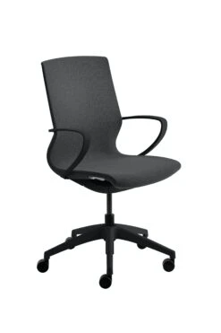 Gestell schwarz, Bezug anthrazit. Durchgehender Netzrücken-/Sitzbezug, höhenverstellbar, automatisch synchronisierende Rücken- und Sitzflächenmechanik, Kunststoff-Fußkreuz, inkl. Universalrollen, stufenlose Höhenverstellung durch Gasfeder geprüft nach ANSi/BIFMA X5.1_2017, Sitzhöhe 43 – 53 cm. German Design Award 2020, iF Design Award 2020, red dot design award 2019.