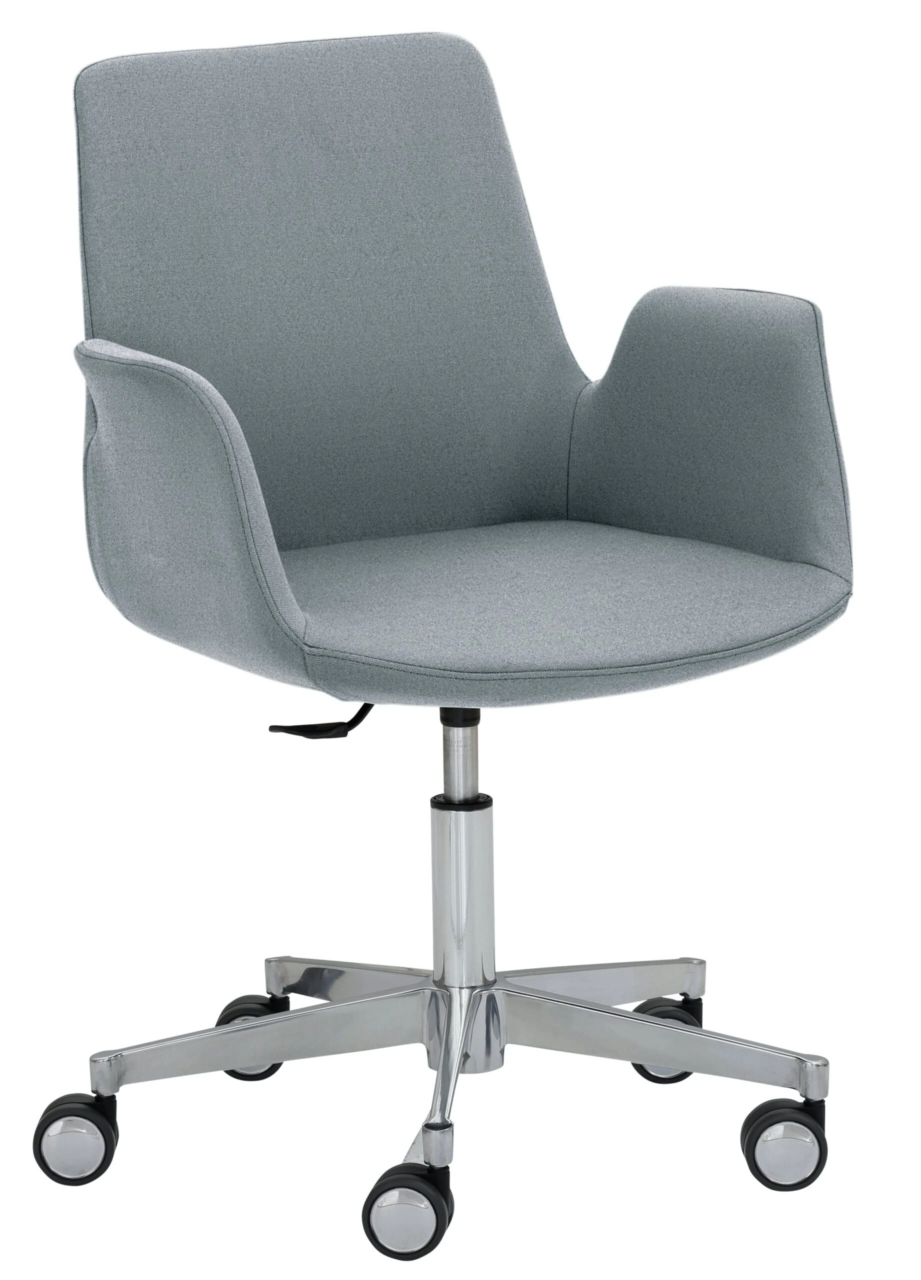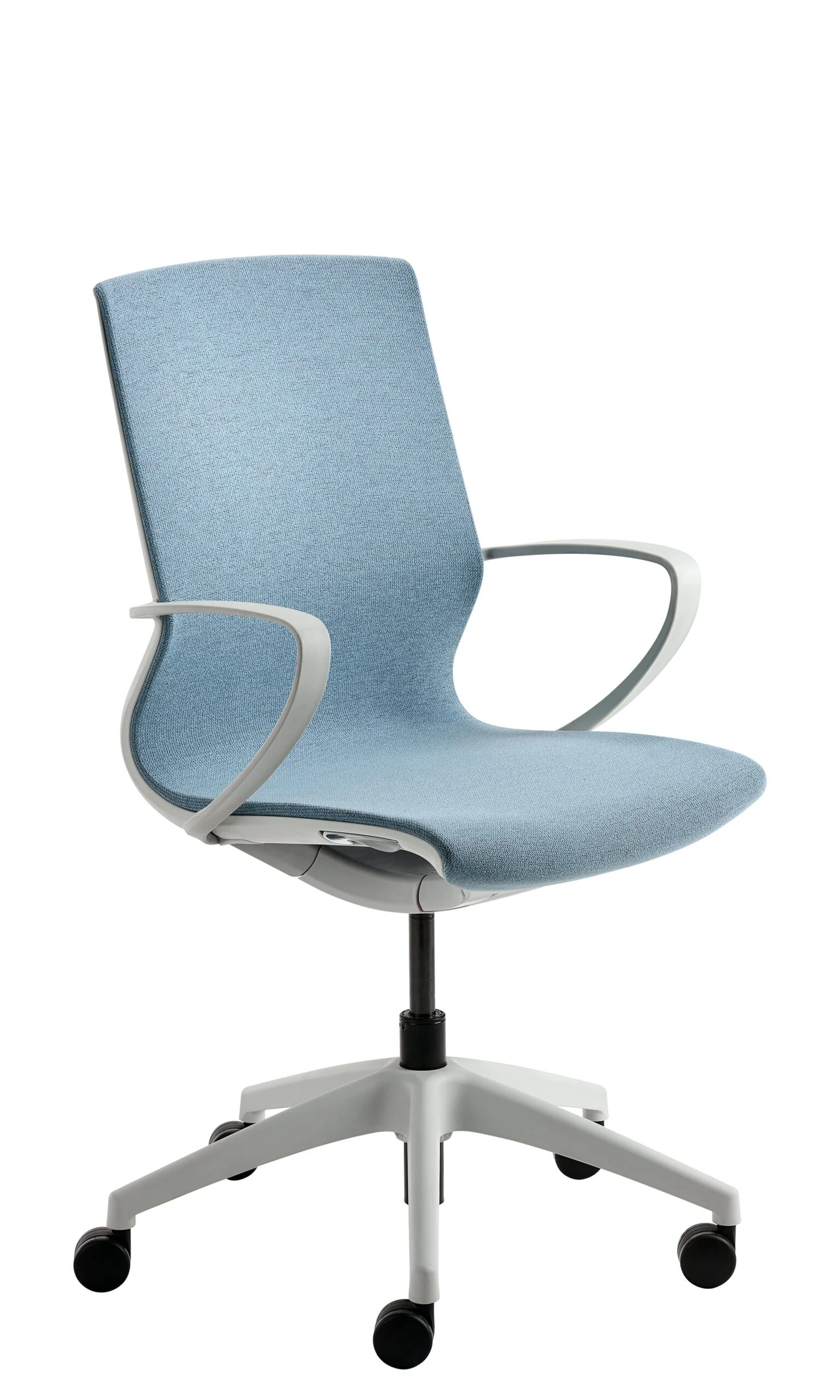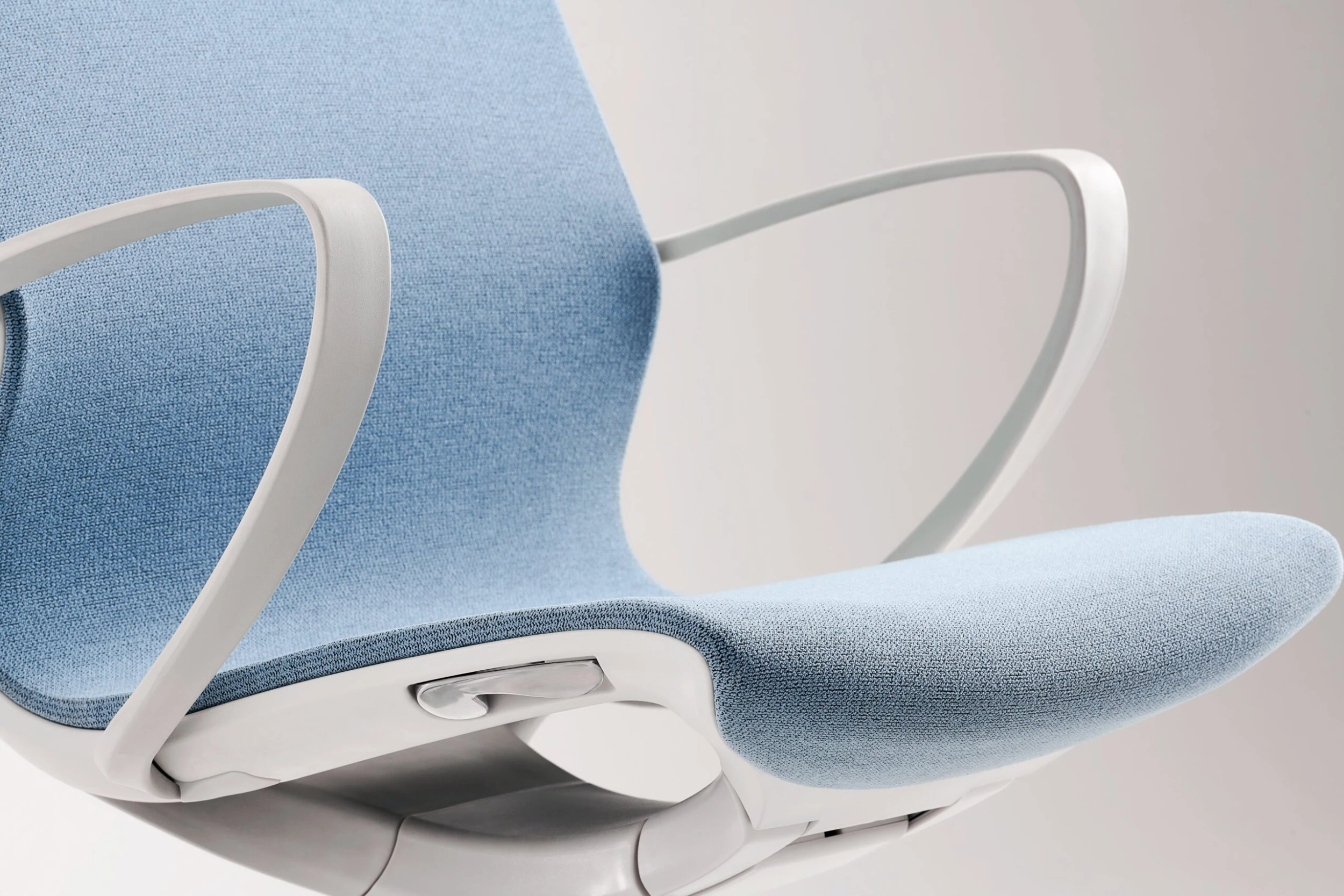 Gestell Rauchweiß, Bezug Hellblau. Durchgehender Netzrücken-/Sitzbezug, höhenverstellbar, automatisch synchronisierende Rücken- und Sitzflächenmechanik, Kunststoff-Fußkreuz, inkl. Universalrollen, stufenlose Höhenverstellung durch Gasfeder geprüft nach ANSi/BIFMA X5.1_2017, Sitzhöhe 43 – 53 cm. German Design Award 2020, iF Design Award 2020, red dot design award 2019.