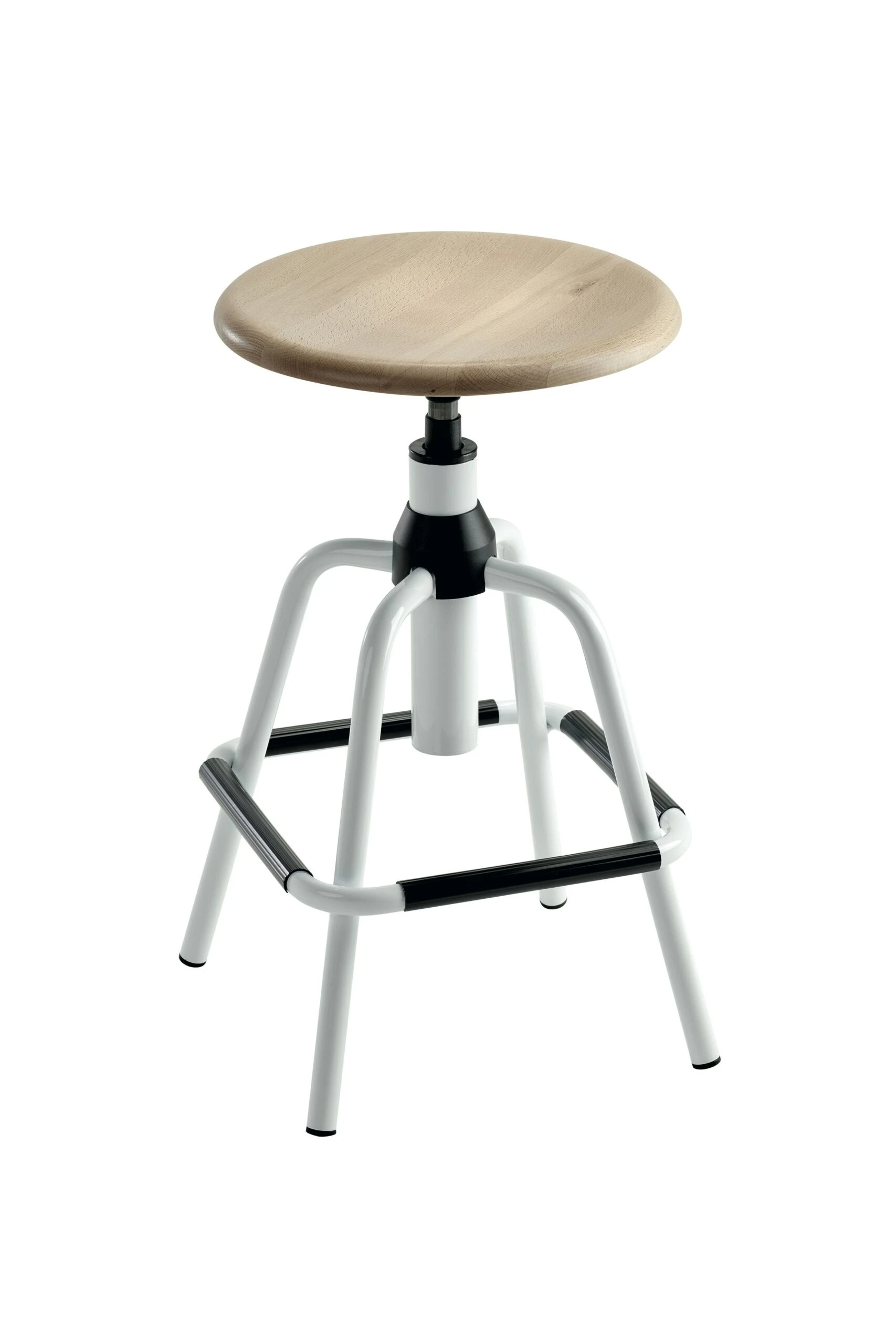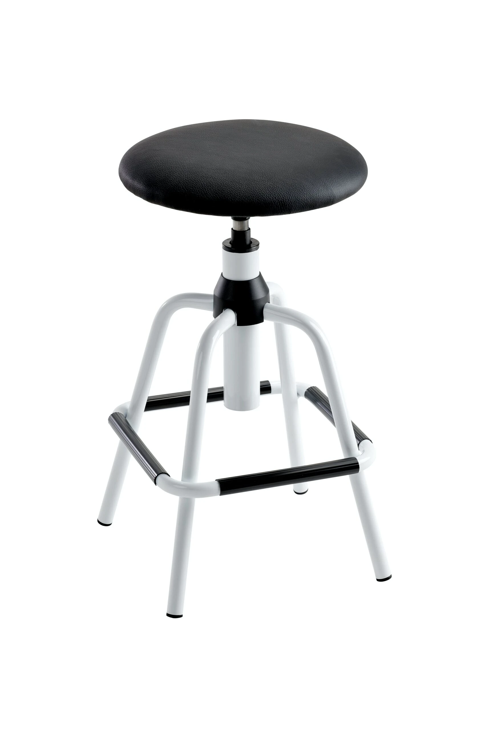 Gestell weiß, Spindel-Höhenverstellung, Muldensitz Buche massiv, natur lackiert, Sitzhöhe 56 – 73 cm.