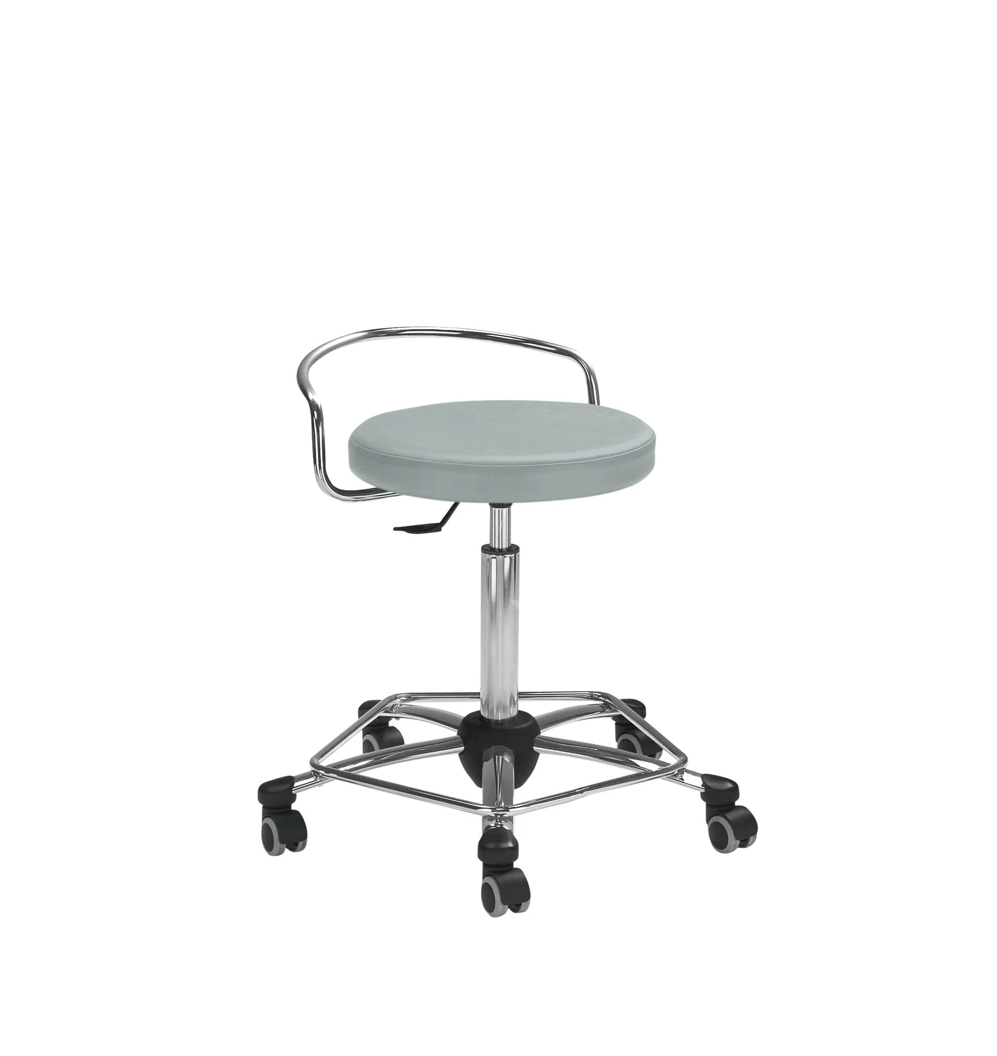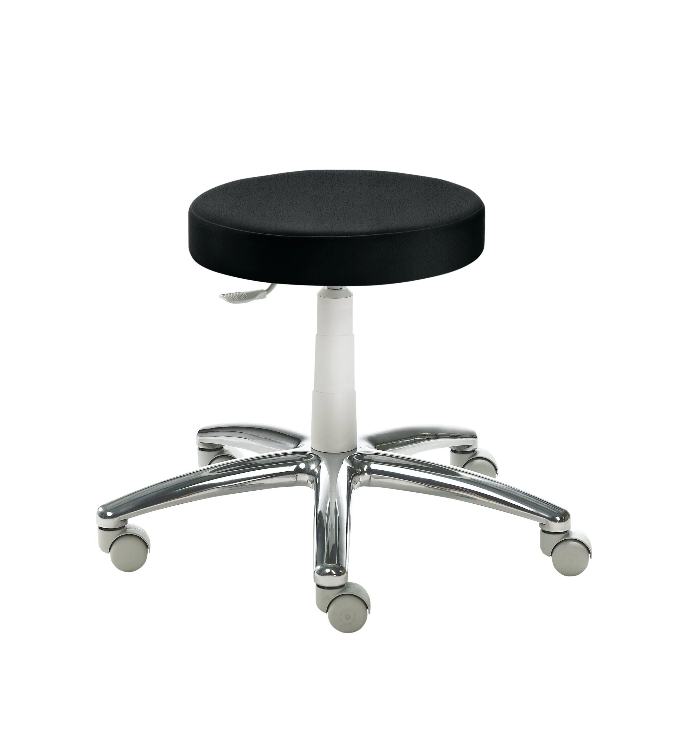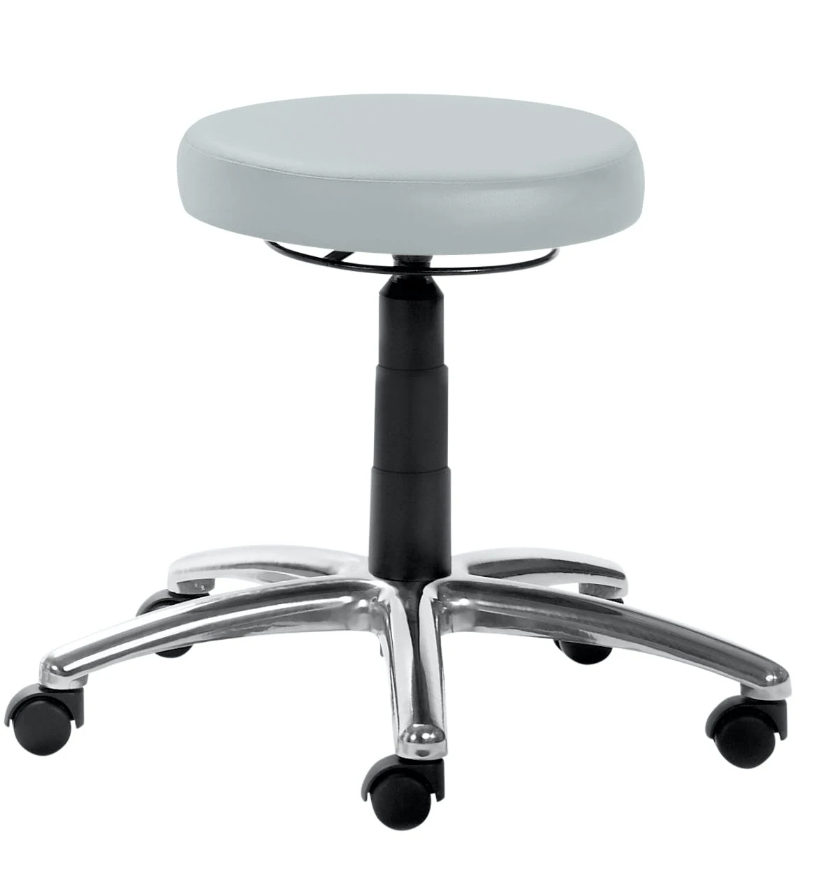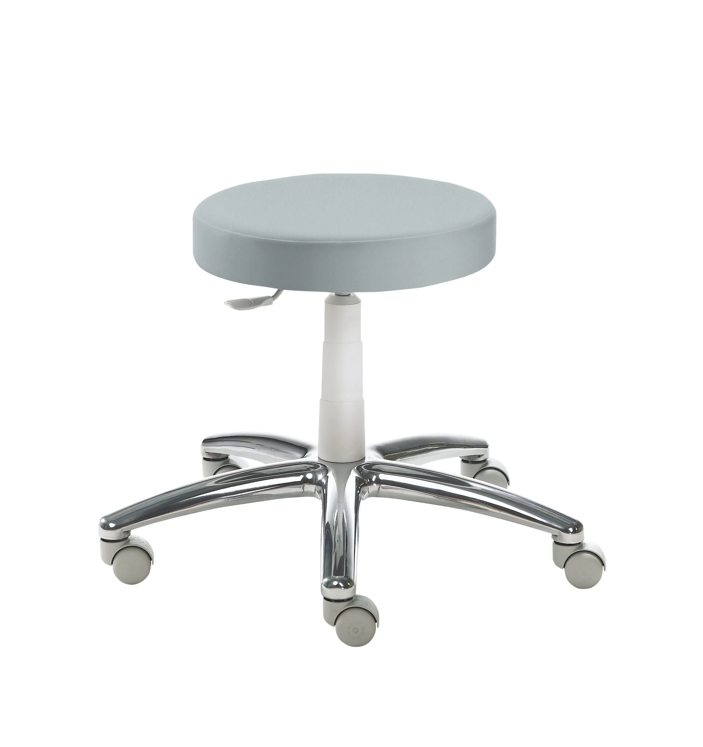 Gestell lichtgrau RAL 7035, gepolsterter Tellersitz, stufenlose Höhenverstellung durch Gasfeder, Alu-Fußkreuz poliert, inkl. Rollen für Teppichböden, Sitzhöhe 40 – 51 cm.