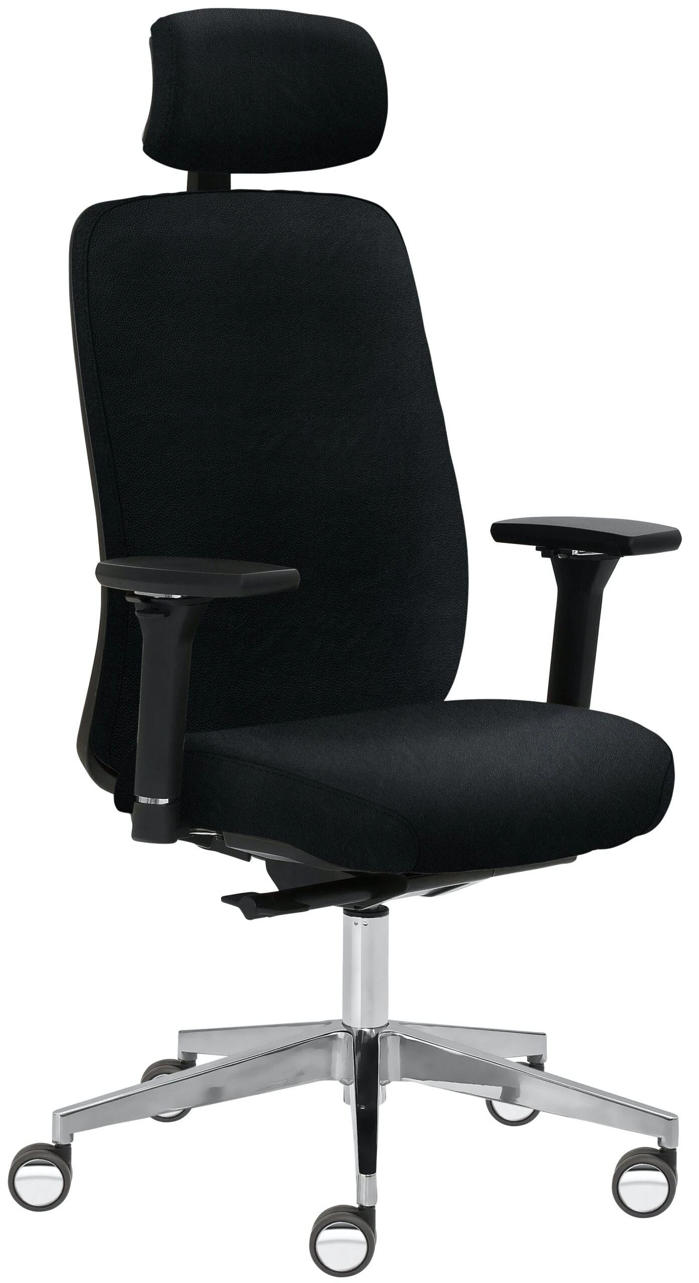 Hoher Rücken, Sitz und Rücken gepolstert, extra stark gepolsterte Sitzfläche für ein Maximum an Komfort, höhenverstellbare Lordosenstütze, stufenlose Höhenverstellung, Sitzhöhe 48 – 59 cm. 4D-Armlehnen schwarz. Kopfstütze gepolstert. Synchronmechanik mit selbstregulierender Gewichtseinstellung und Sitztiefenverstellung. Geeignet bis 150 kg, Alu-Fußkreuz inkl. Schwerlastrollen (auch für Hartböden geeignet) und passender Gasfeder.