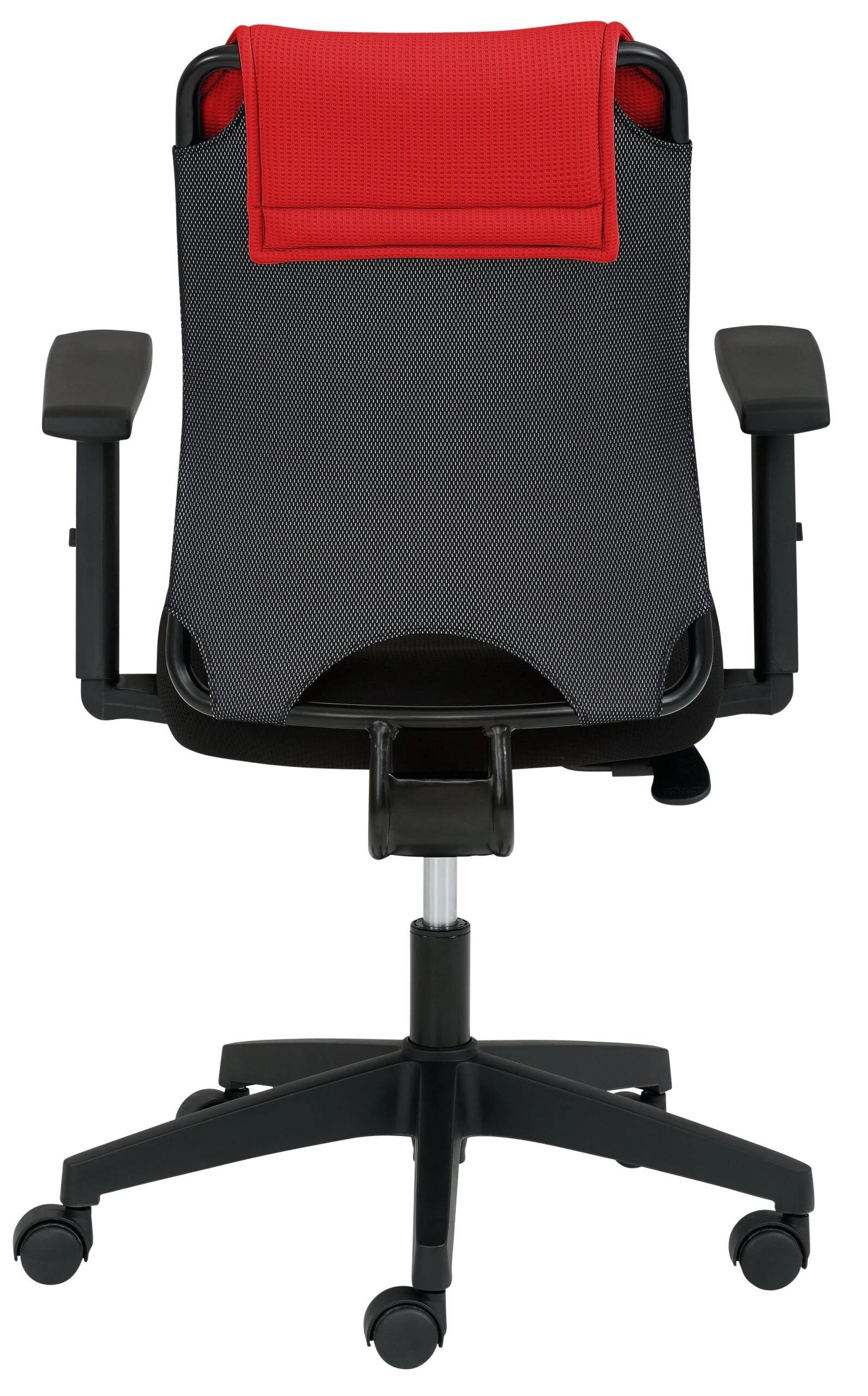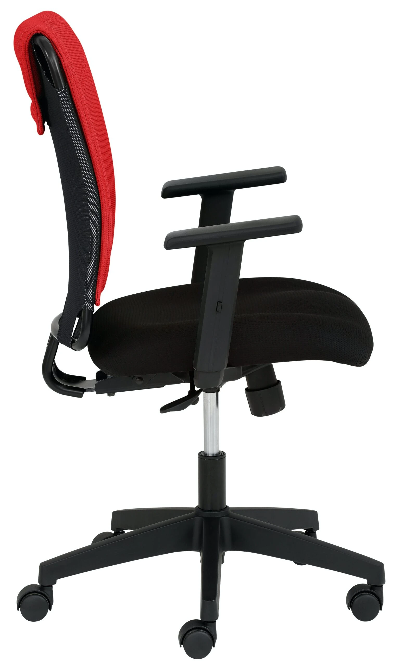 Sitz schwarz gepolstert, Rücken atmungsaktives Elastikgewebe, Synchronmechanik mit individueller Gewichtseinstellung, Fußkreuz schwarz, stufenlose Höhenverstellung durch Gasfeder, inkl. Rollen für Teppichböden, Sitzhöhe 43 – 52 cm. Rückenbezug rot. Inkl. höhenverstellbarer Armlehnen schwarz 8185.