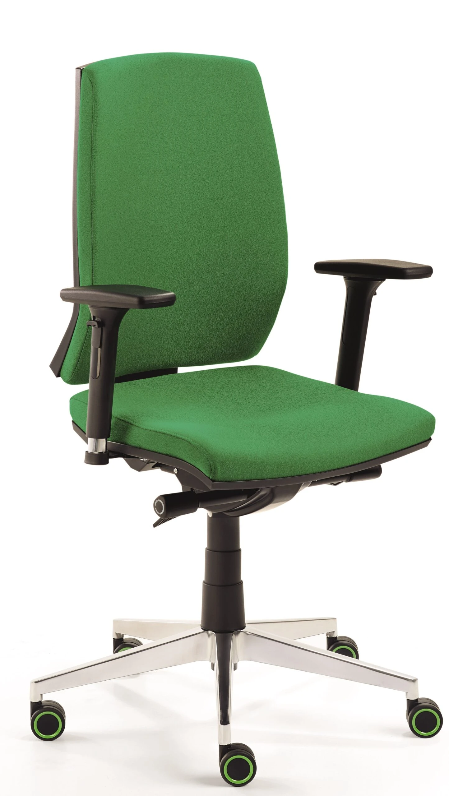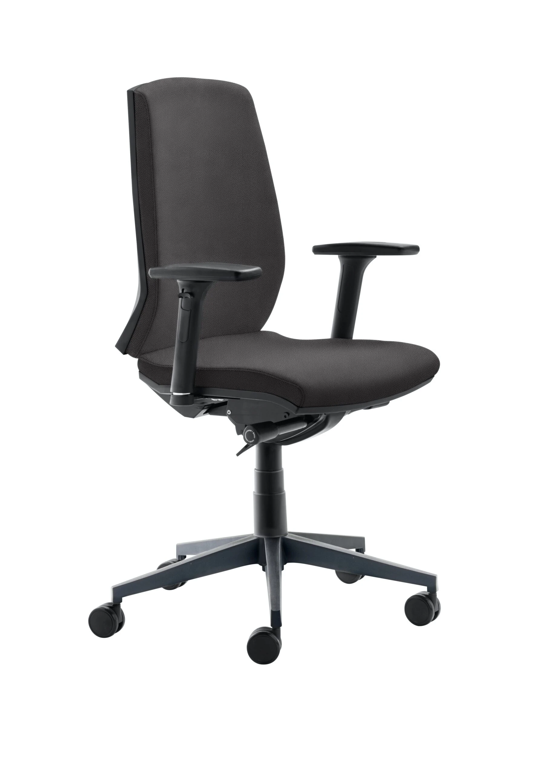 Hoher Rücken, Rückenhöhe 7-fach verstellbar, Synchronmechanik mit individueller Gewichtseinstellung und Sitztiefenverstellung, stufenlose Höhenverstellung durch Gasfeder, Kunststoff-Fußkreuz und Kunststoffteile schwarz, inkl. große Rollen für Teppichböden, Sitzhöhe 47 – 57 cm. Armlehnen höhenverstellbar, Pad verstellbar.