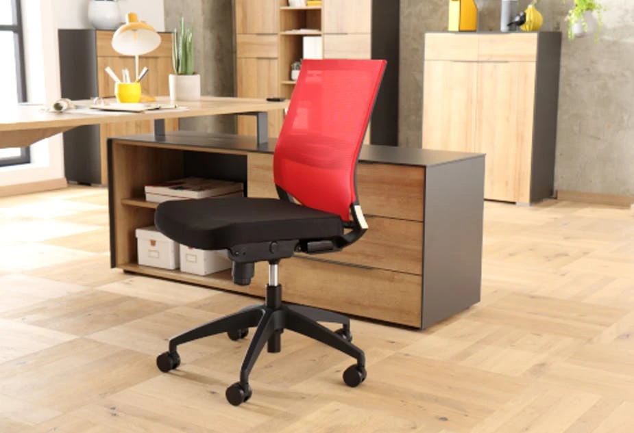 Stoffpolstersitz schwarz, Netzrücken rot, höhenverstellbare Lendenwirbelstütze, Synchronmechanik mit individueller Gewichtseinstellung, Kunststoff-Fußkreuz schwarz, inkl. große Rollen für Teppichböden, Sitzhöhe 46 – 58 cm. Getestet nach Bürostuhlnorm EN 1335 1 – 3.