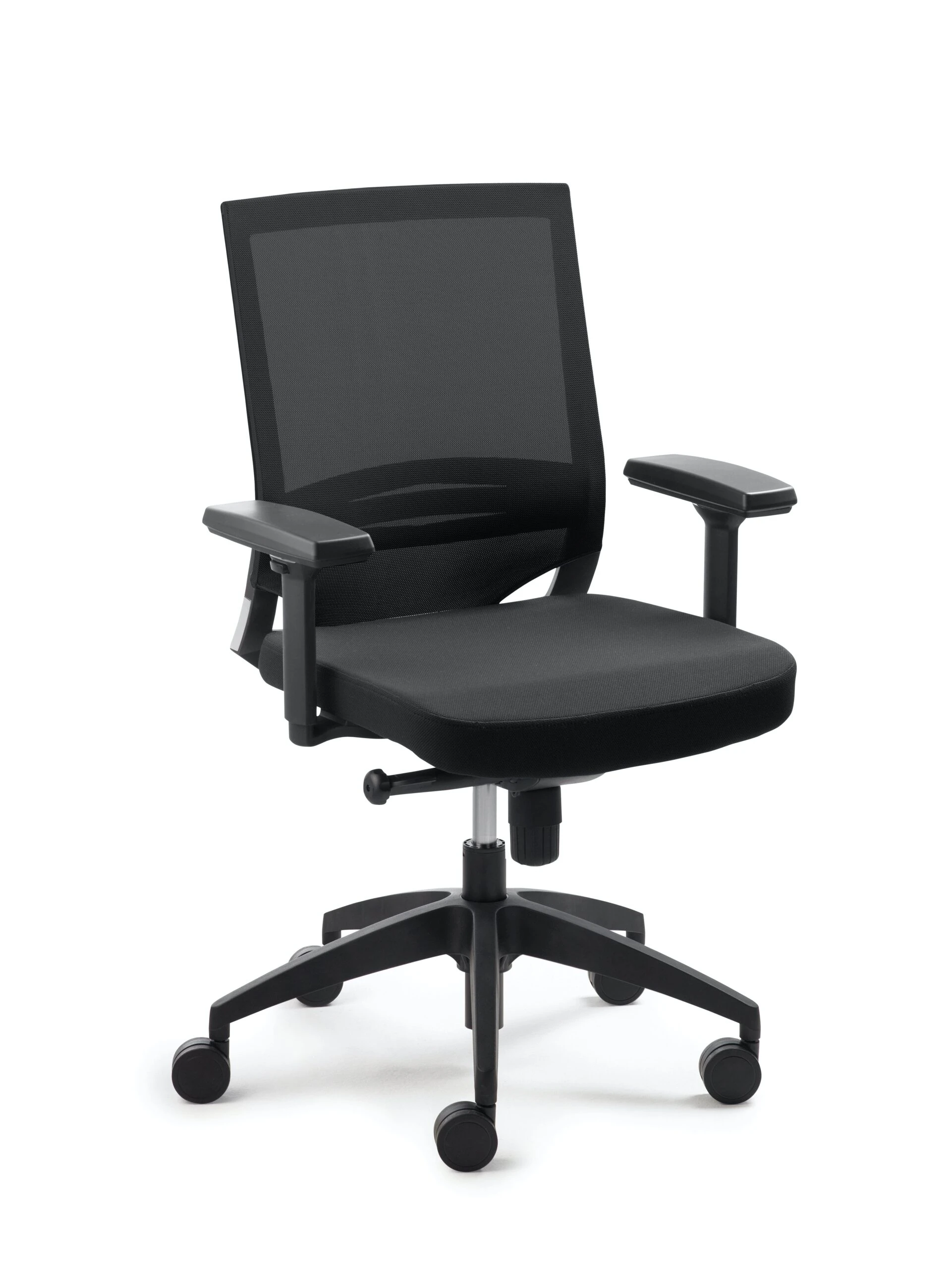 Stoffpolstersitz schwarz, Netzrücken schwarz, höhenverstellbare Lendenwirbelstütze, Synchronmechanik mit individueller Gewichtseinstellung, Kunststoff-Fußkreuz schwarz, inkl. große Rollen für Teppichböden, Sitzhöhe 46 – 58 cm. Getestet nach Bürostuhlnorm EN 1335 1 – 3. Armlehnen mehrfach verstellbar, mit PU-Softpad.