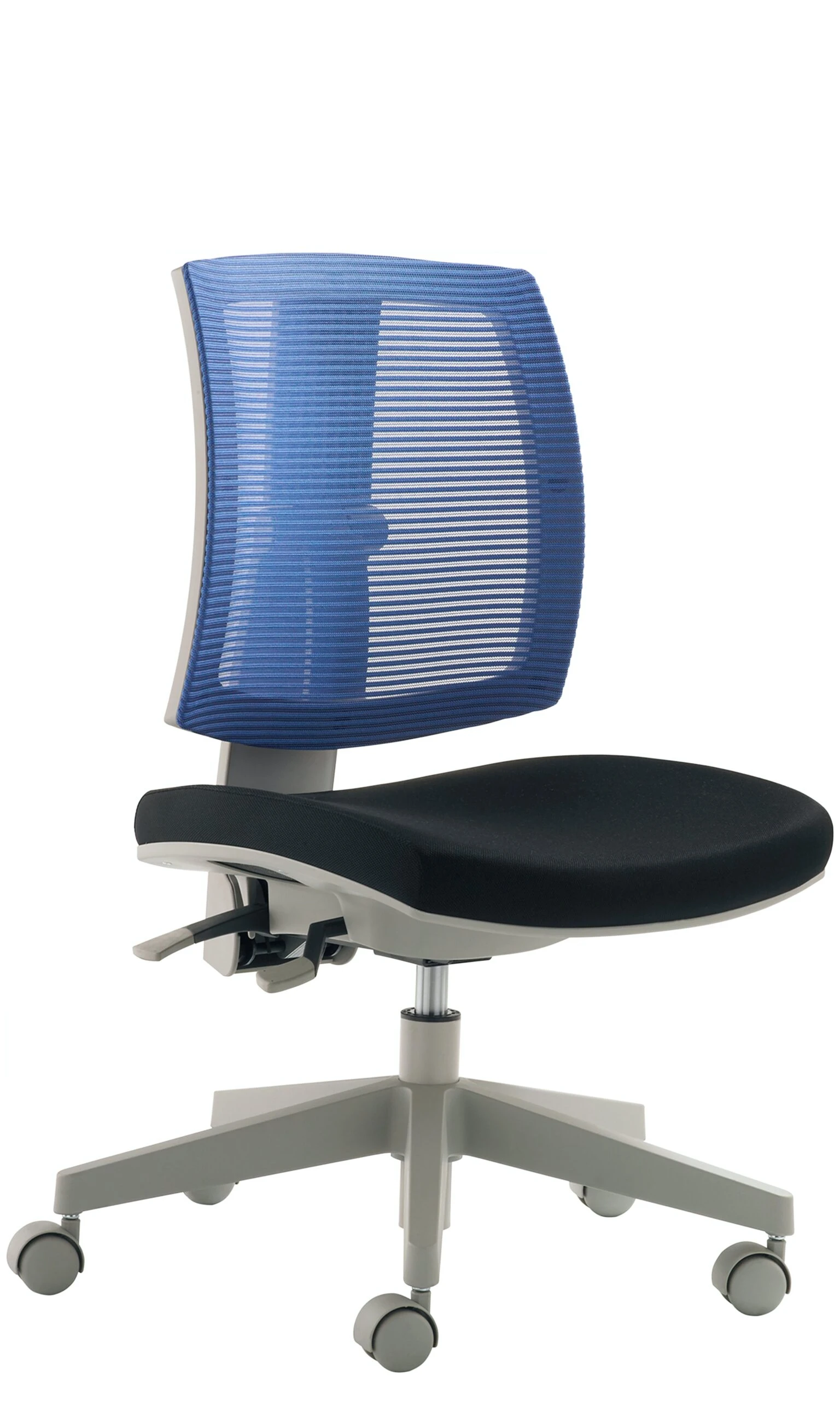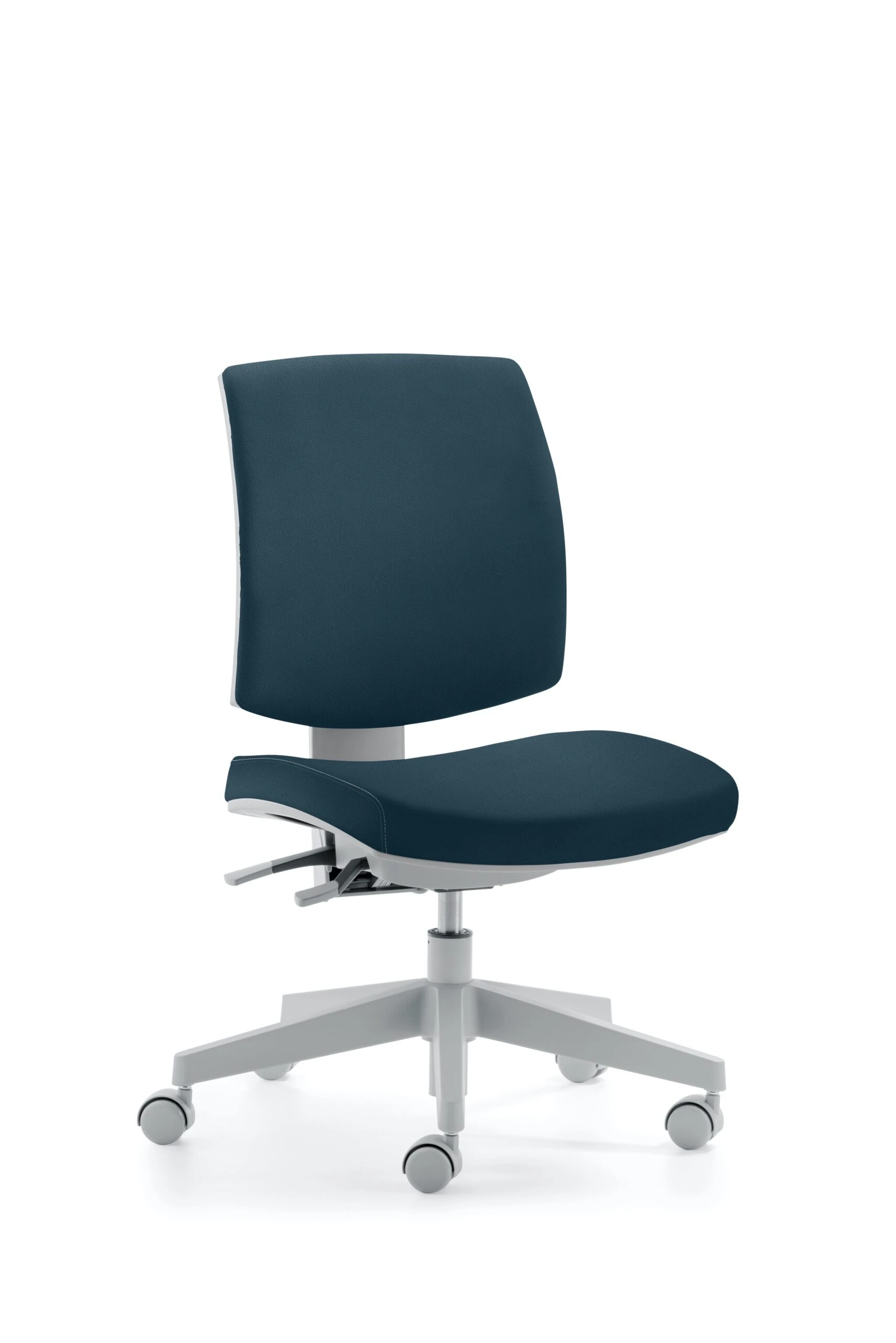 Gestell grau, Sitz und Rücken gepolstert, Sitztiefe durch Rückenverstellung sehr leicht und stufenlos verstellbar, stufenlose Höhenverstellung durch Gasfeder, Fußkreuz Kunststoff grau, inkl. Universalrollen, Sitzhöhe 39 – 52 cm. Belastbar bis 150 kg.