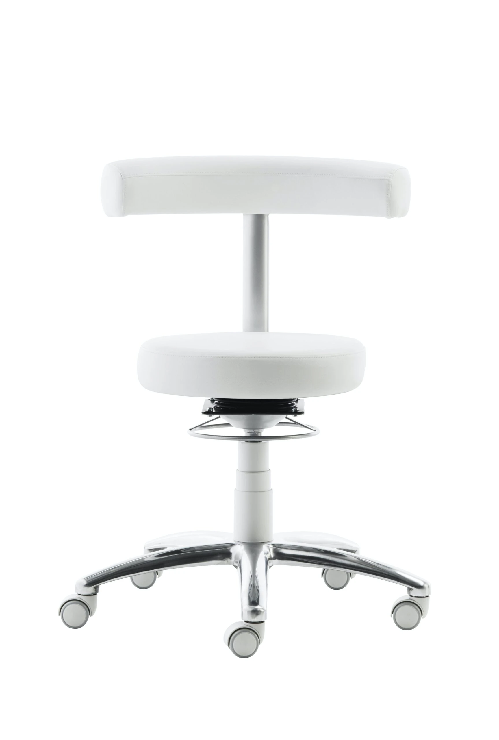 Sitz und Rücken gepolstert, Rücken-Rasterhöhenverstellung, stufenlose Höhenverstellung durch Gasfeder, Ringauslösung, Kunststoff-Fußkreuz schwarz, inkl. Rollen für Hartböden, Sitzhöhe 44 – 56 cm.