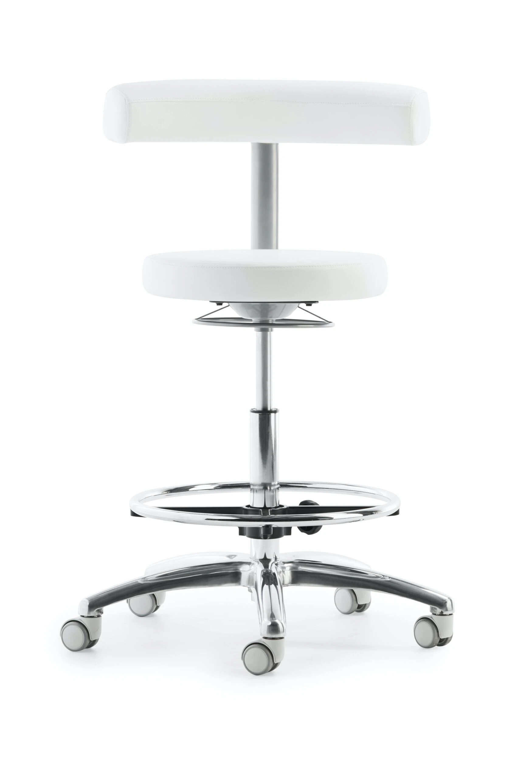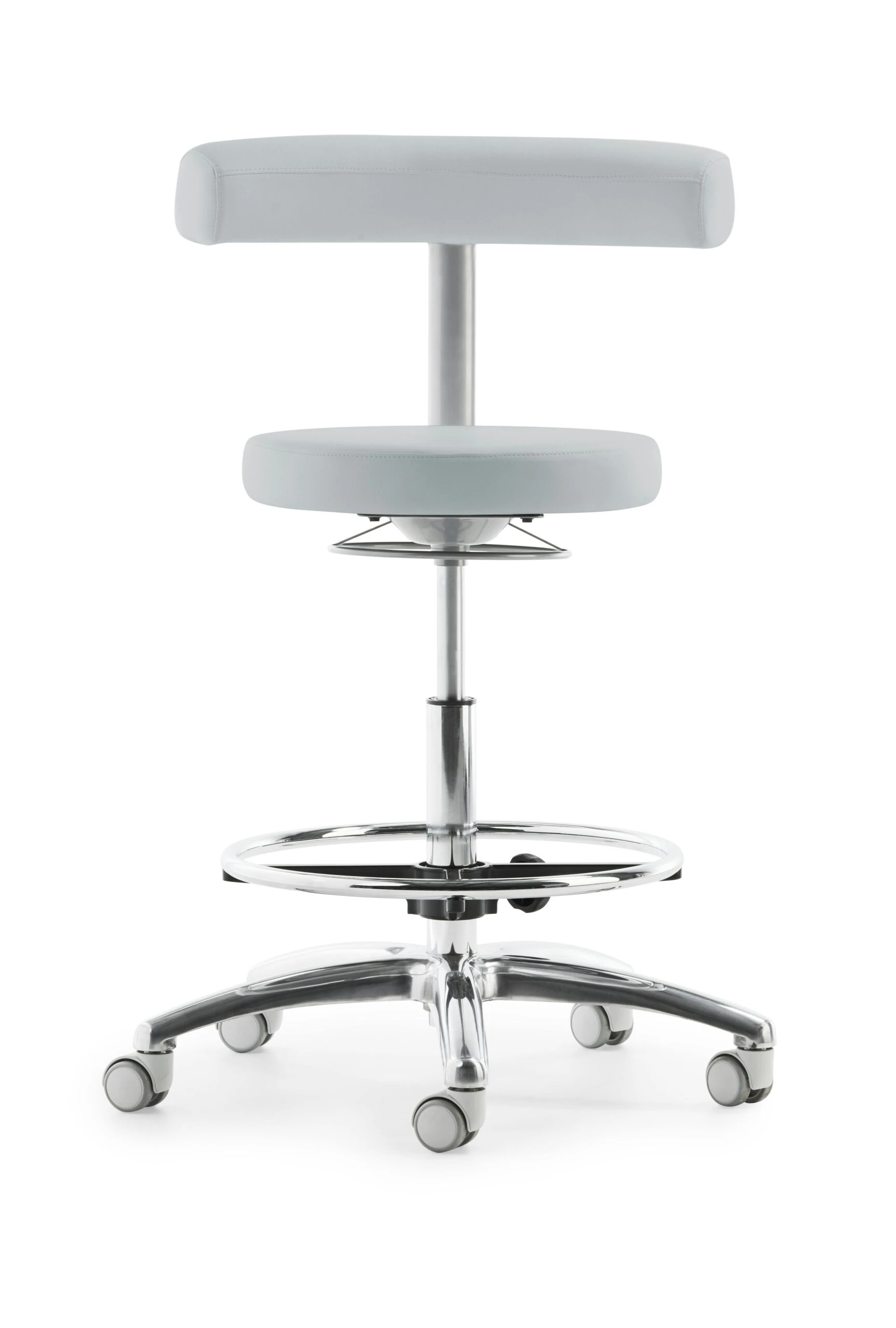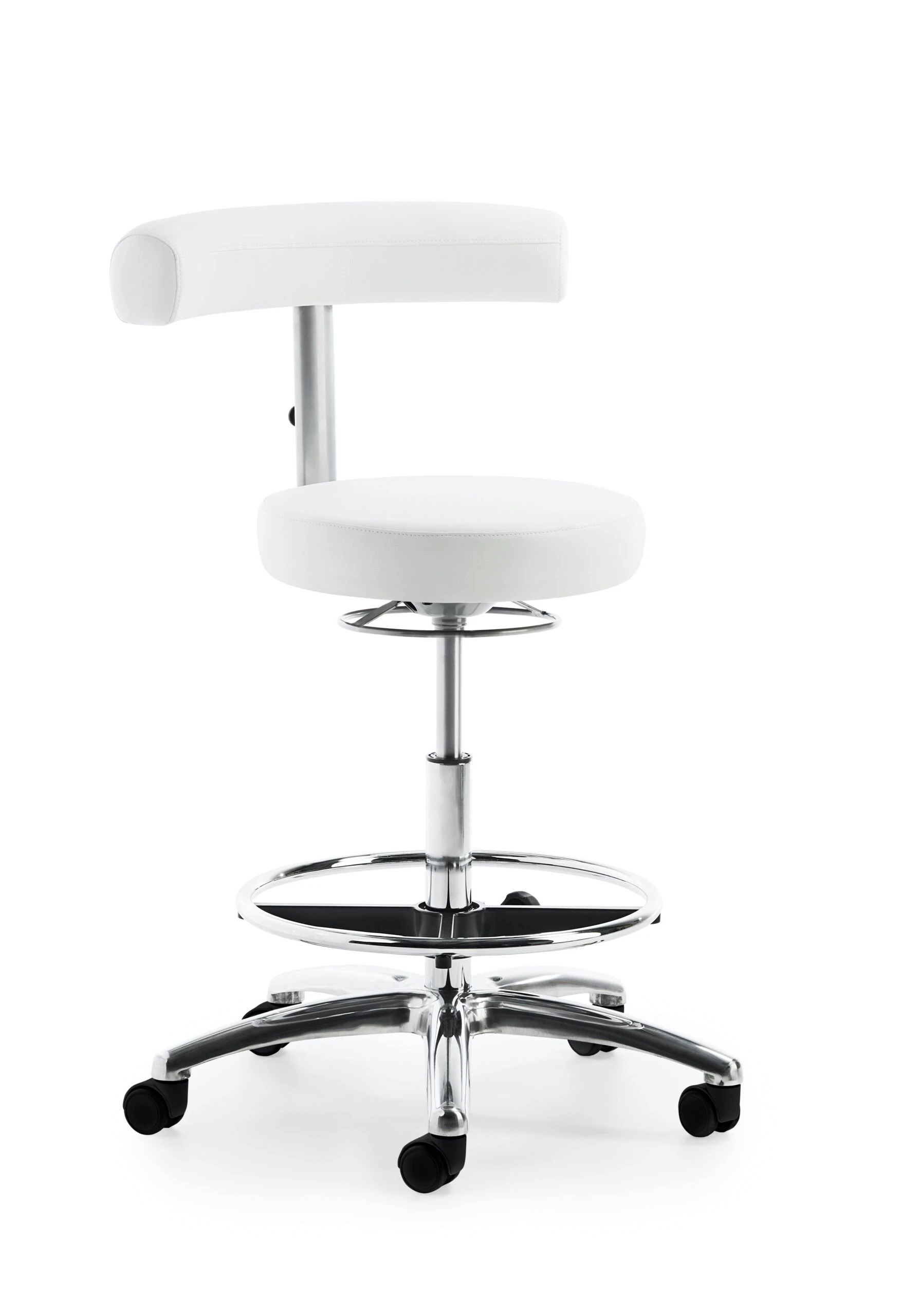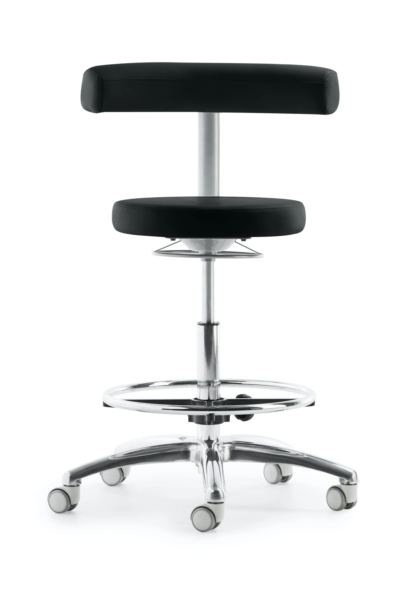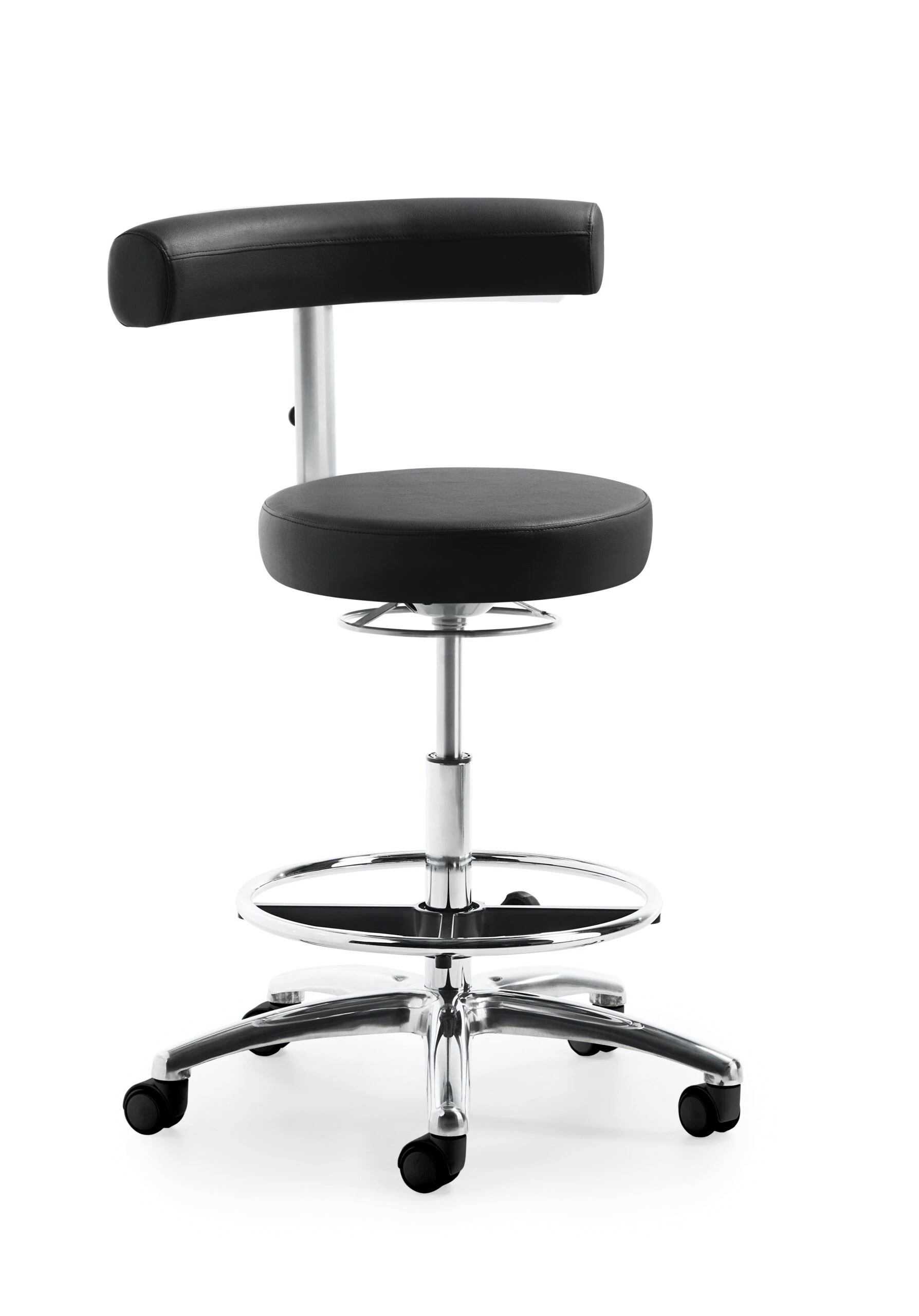 Sitz und Rücken gepolstert, Rücken-Rasterhöhenverstellung, stufenlose Höhenverstellung durch Gasfeder, Ringauslösung, Gestell schwarz und Alu-Fußkreuz poliert, höhenverstellbarer Fußring, inkl. Rollen für Hartböden, Sitzhöhe 54 – 74 cm.