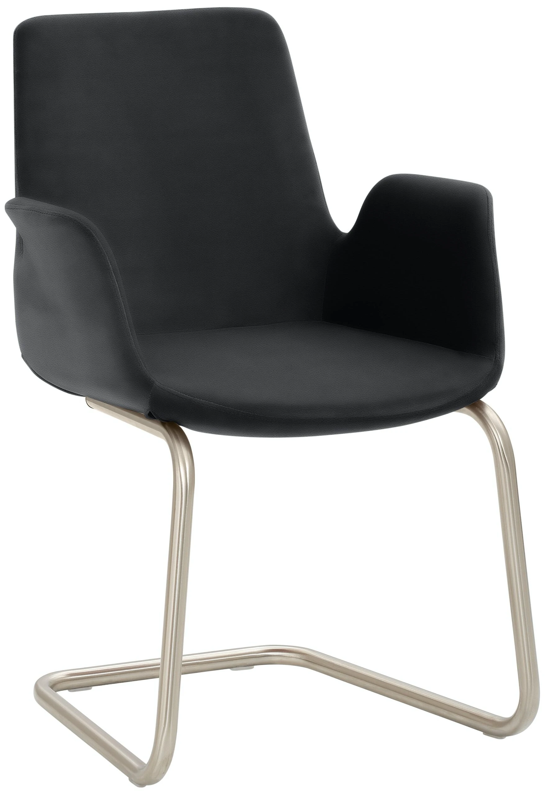 Freischwinger-Gestell, Chrom gebürstet Edelstahllook, mit integrierten Armlehnen, rundum gepolstert, Sitzhöhe 49 cm.