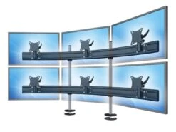 Die MonLines Para 3+3 Monitor Tischhalterung Einbau MA 25-32Zoll WS XL in grau ist eine Multi-Monitor-Halterung mit Durchschraubbefestigung von drei Monitoren an jeweils 2 Traversen mit einer Tragkraft von 15 kg pro Monitorhalter mit VESA-Standard 75×75 und 100×100 mm.
