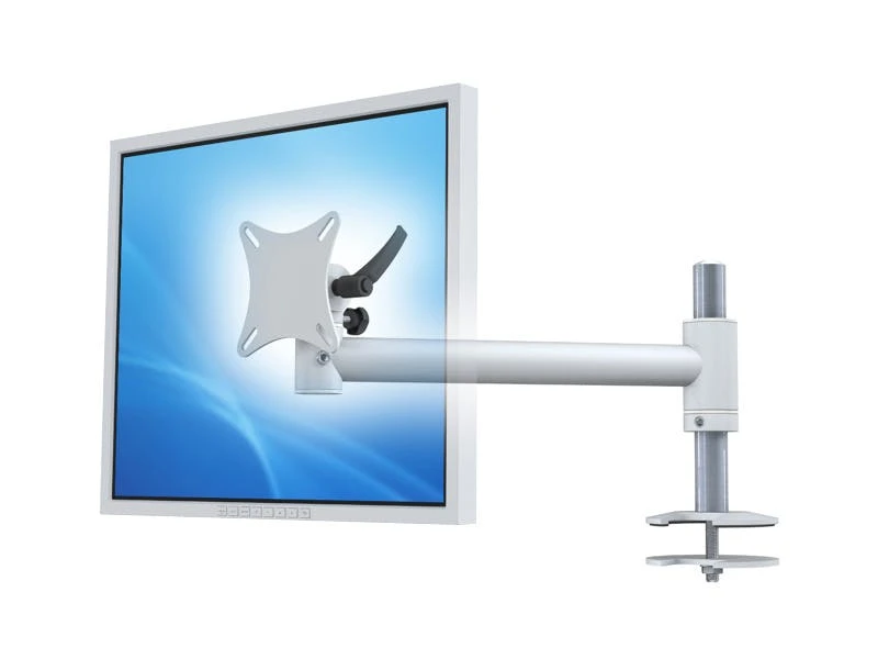 Die Monitor Halterung MonLines TFT-Vario Tischhalterung Einbau mit Kabelauslass in lichtgrau RAL 7035 wird mit einer Durchschraubbefestigung in dem Tisch integriert und verfü,gt ü,ber eine Tragkraft von 20 kg mit VESA Standard 75×75 und 100x100mm.