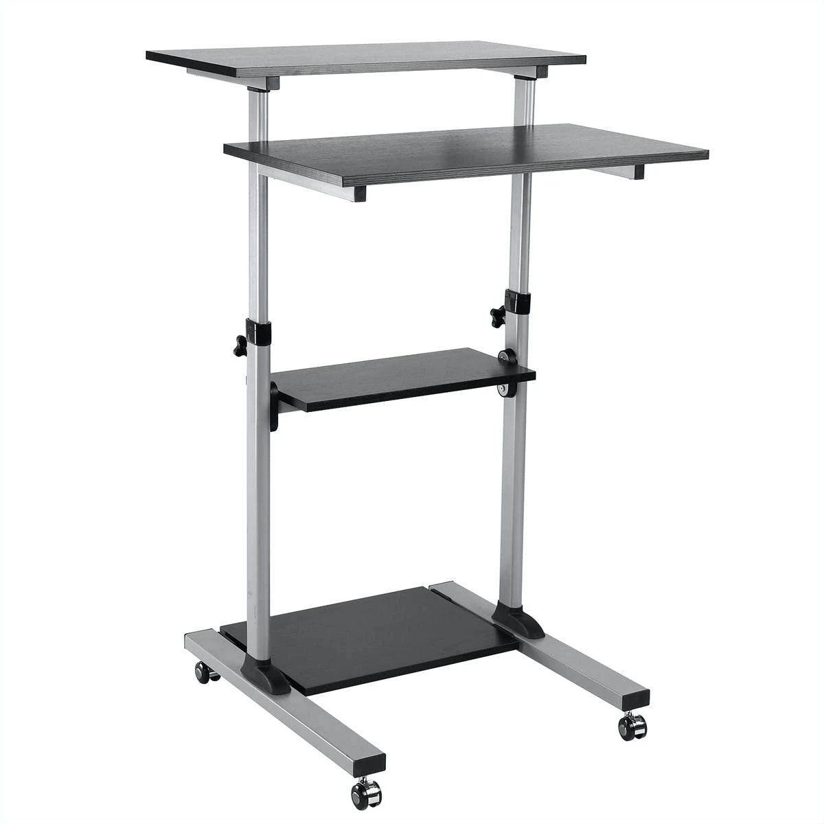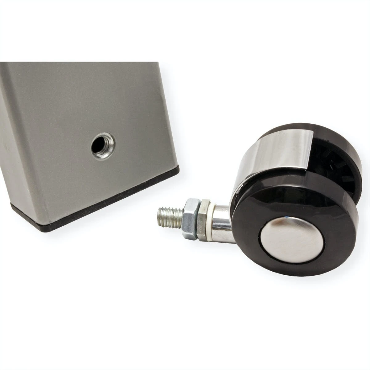 Arbeiten Sie gesünder! Ein Wechsel von Sitzen und Stehen ist gut für Ihre Wirbelsäule. Mit dem höhenverstellbaren ROLINE PC-Steh-Arbeitsplatz können Sie jetzt die Arbeit am PC im Stehen erledigen.. . PC-Station für die Arbeit im Stehen oder als Rednerpult für Präsentationen. Stabiles Metall- / Kunststoffgestell. Grosse Deckplatte für den Monitor und/oder als Ablagefläche (BxT: 70×35,5cm). Tastaturablage und Mausablage (BxT: 70x40cm). Zwischenebene (BxT: 47,2 x 23cm), z.B. für Drucker nutzbar. Bodenplatte (BxT: 45,5 x 35cm). Mobil durch 4 Rollen, davon zwei feststellbar. Farbe: Gestell in lichtgrau, Platten in schwarz mit Umrandung. Abmessungen (HxBxT): min. 81 / max. 125 (+12,8 cm) x 70 x 70,5 cm. Gewicht: 18 kg