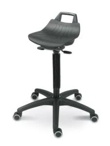 Stehhilfe, mit Sitzneigungsverstellung, Sitz aus Kunststoff in schwarz, Sitz Höhe 520 – 710 mm, Höhenverstellung über Gasfeder, Gestell aus Kunststoff in schwarz, Gestell mit Rollen.