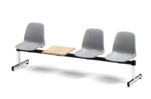 Traversenbank, 3 Sitze, Anordnung Sitz-Tisch-Sitz-Sitz, Breite x Tiefe 2350 x 600 mm, Sitzschale aus Kunststoff in lichtgrau, T-Fußgestell aus Stahl verchromt.