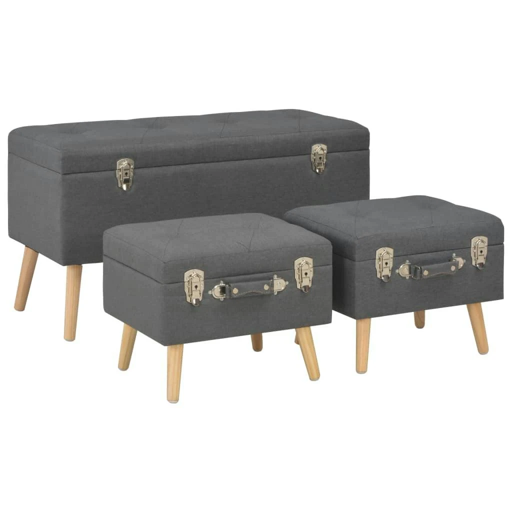 Diese vielseitigen und praktischen Hocker strahlen Gemütlichkeit aus und fügen sich perfekt in jeden Einrichtungsstil ein. Diese Hocker sind mit Stoff bezogen und mit Schaumstoff gepolstert, was sie äußerst komfortabel macht. Ihre Massivholzbeine sorgen nicht nur für Stabilität und Langlebigkeit, sondern verleihen ihnen auch einen eleganten Look. Unter der Sitzfläche befindet sich ein Ablagefach, das zusätzlichen Stauraum zur Verfügung stellt. Die Hocker sind leicht zu montieren. Lieferung umfasst 1 großen Hocker und 2 kleine Hocker.